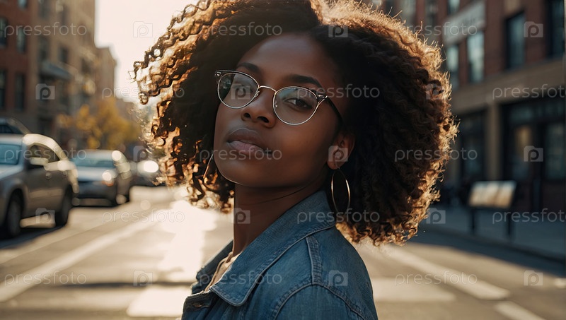 Афроамериканская девушка в очках, голубой рубашке, городской улице, кудрявые распущенные волосы, закат. Борьба с коррекцией, четкая форма рамы, маркетинговый дизайн, блоги, медицинские ссылки, текстовое поле