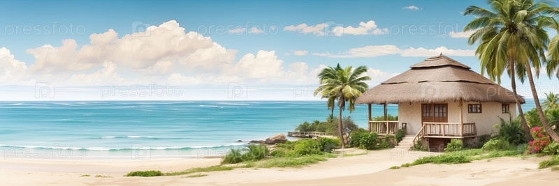 Приморский бунгало с кокосовыми пальмами, частная вилла со всем включенным, тропический комфорт, цифровое рисование мультфильмов