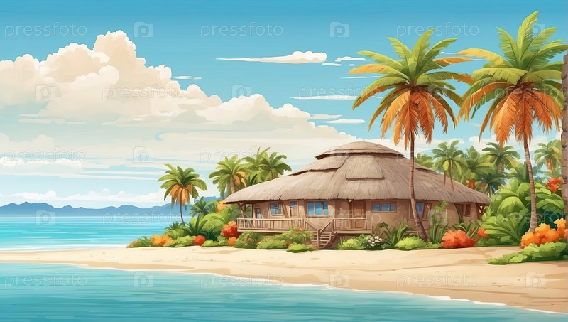 Береговое бунгало с пальмами на бирюзовой воде, частный отель "все включено", тропический туризм, цифровая иллюстрация, яркий цветовый стиль