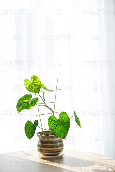 Растение сингония в горшке на солнечном подоконнике, минималистический естественный декор, уход: регулярная влажность, стойкость к тени, кислород внутри помещений, экологически чистый интерьер