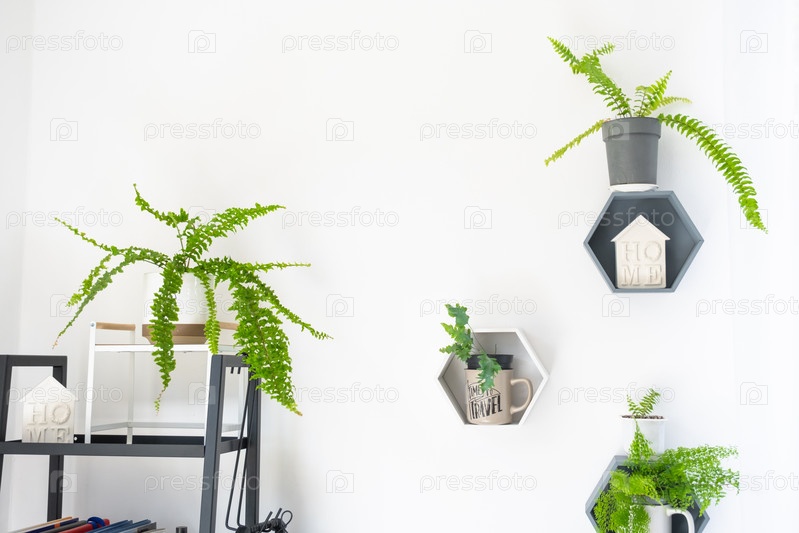 Яркая комната, аккуратная открытая полка, горшечные растения, современный минимализм, солнечный свет, оконные аксессуары, рекламное использование для мебели или цветочных магазинов