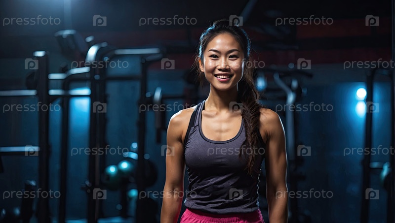 Азиатская спортсменка и фитнес-тренера в тренажерном зале, тренер по оздоровлению, улыбающийся, портрет персонала клуба, энергетическое здоровье, промоакция, использование социальных сетей, текстовое пространство
