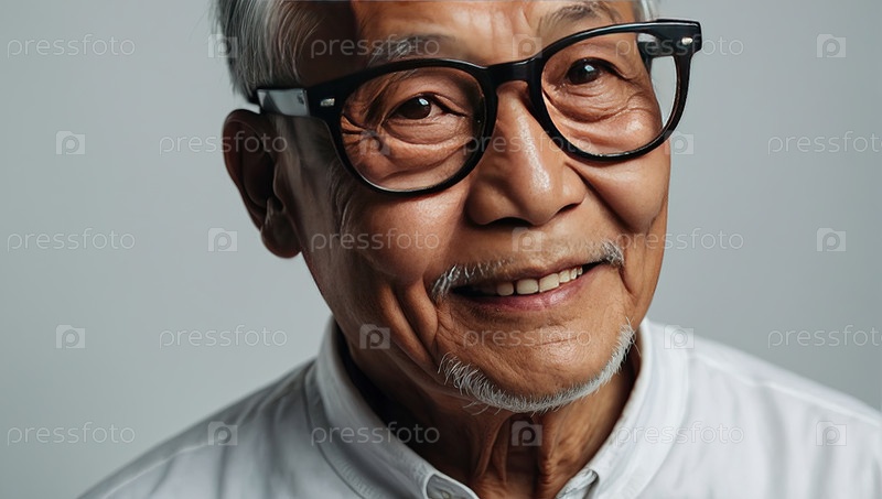Пожилой азиат в современных очках улыбается на камеру, серый фон, продвижение решений по уходу за глазами для пожилых людей, возрастные изменения зрения, текстовое пространство в стиле баннера