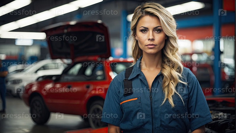 Серьезная блондинка-белая женщина-механик в серой форме на автосервисе, современной автомобильной мастерской, технический сотрудник, уверенный, с свободной зоной для текста