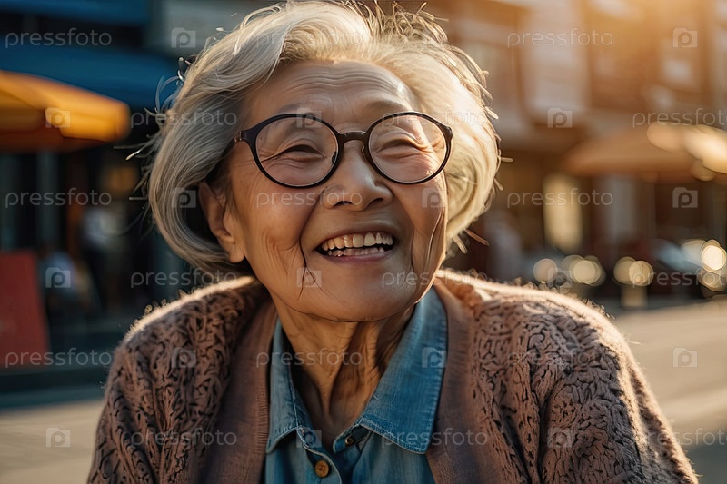Улыбающаяся пожилая белокожая леди, синяя куртка, толстые черные очки, закат на улице. пресбиопия, астигматизм, размытое зрение, поддержка очков, сообщение в медицинских СМИ, секция онлайн-советов