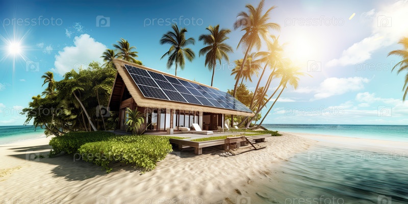 Экологически чистый бунгало на берегу моря с солнечной крышей, возобновляемой энергетикой, устойчивым туристическим размещением, океанским отдыхом, цифровыми мультфильмами