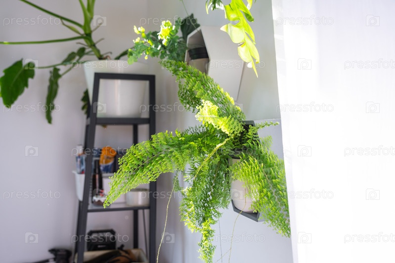 Зеленые растения вокруг полки лестницы, нейтральные стены, окно с дневным светом, легкий интерьер, минимальное прикосновение, ручка оконная, фотосессия, дизайнерские блоги