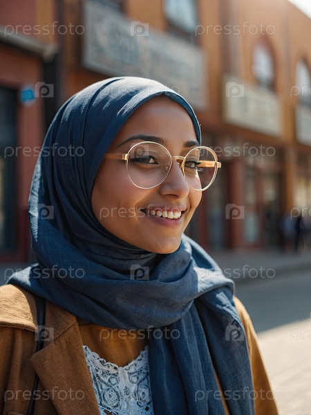 Арабская женщина в синем хиджабе и очках, улыбающаяся на солнечной городской улице с пространством для текста, очков, зрения, оздоровления, здорового образа жизни, консультирования, расширения прав и возможностей