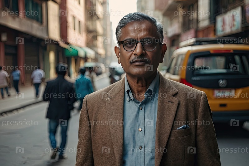 Пожилой индиец в очках, стоящий на оживленной улице, бежевая куртка, задумчивый городской фон Индии. возрастное снижение зрения, необходимость тестирования зрения, дилемма очков, пространство для текста