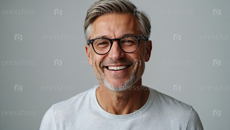 Уверенный старший белый мужчина в очках, белая рубашка, седые волосы, улыбка, студия, чистый фон. проблемы со зрением, нужды коррекции, счастливый, место для текста