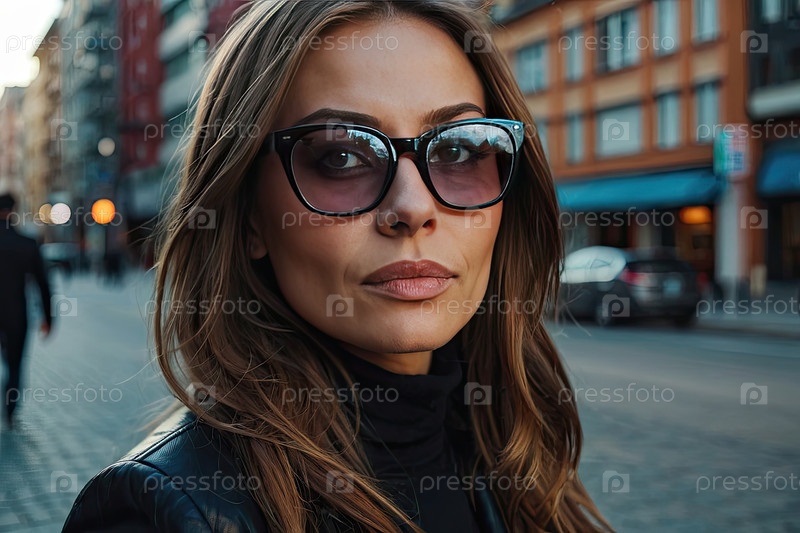 Современная белая женщина в солнцезащитных очках, длинные коричневые волосы, центр города, нейтральное настроение, потеря зрения, подходящие для взрослых очки, выборочный стиль, оживленная улица, копирайтинг