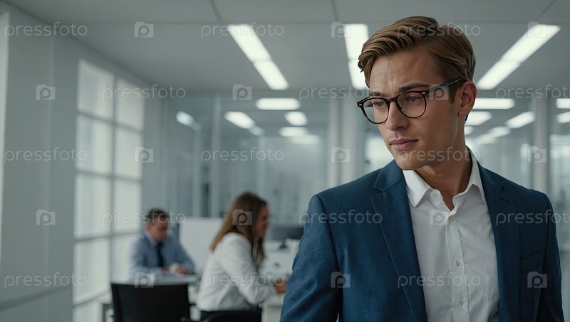 Бизнес-консультант в костюме и очках, обсуждающий проект в открытом офисе, цифровые экраны, защита зрения, командная работа, очки, корпоративная эффективность, пространство для текста