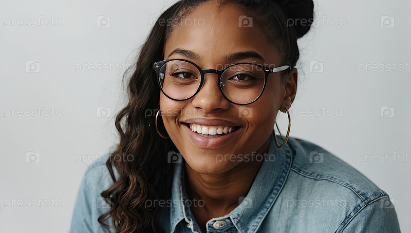 Черная девочка-подросток с безруковыми очками, большая улыбка, боковая косуля, джинсовый верх, домашний интерьер. проблемы со зрением, модная коррекция, повседневная жизнь, справка для приложений здоровья или цифровых блогов