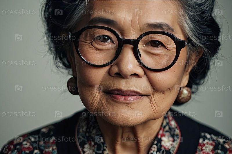 Пожилая азиатская женщина в ретро круглых очках, волнистые седые волосы, задумчивая, студия, бледный фон. возрастная дегенерация желтого пятна, астигматизм, гиперопия, решение зрения пожилые люди, шаблон флайер для здоровья