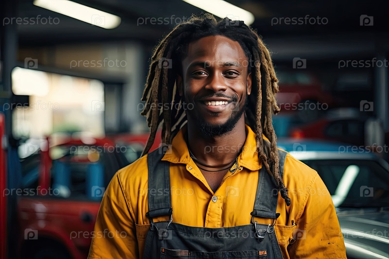 Портрет улыбающегося чернокожего механика-мужчины с дрейдоками в желтой и синей форме на автосервисе, уверенный профессионал, команда обслуживания автомобилей, технический персонал, место для текста