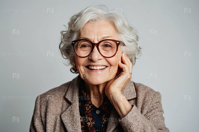 Пожилая белокожая женщина в коричневой куртке и очках, косые седые волосы, счастливая, фотостудия. Трудности с чтением внимательно, коррекция возраста, стильные очки, социальная кампания, карточка советов, печатное пространство