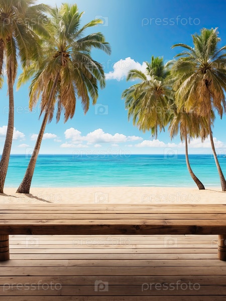 Вертикальная деревянная сцена, пальмовый курорт, солнечный летний туризм, подиум для продукта, еды или приветственного знака, большое пустое пространство на столе