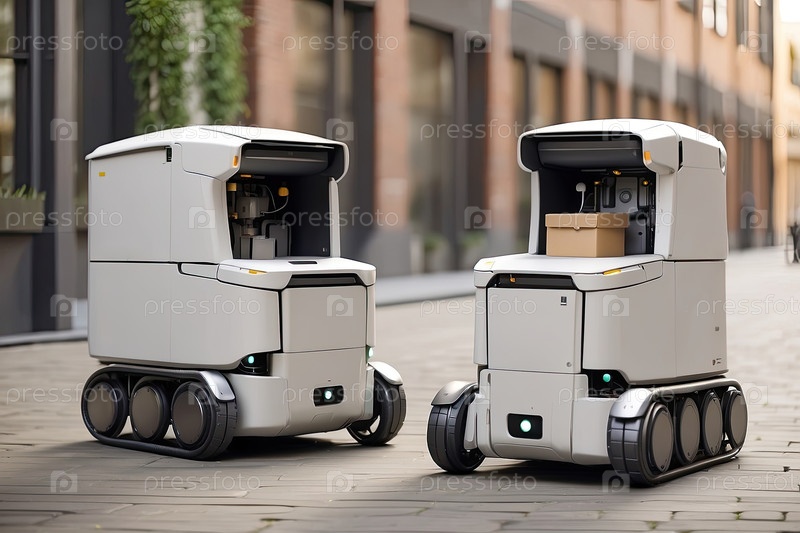 Пара автономных белых роботов-курьеров доставляют посылки вместе в городской среде, интеллектуальная логистика, технологии будущего, командная работа в сфере услуг доставки