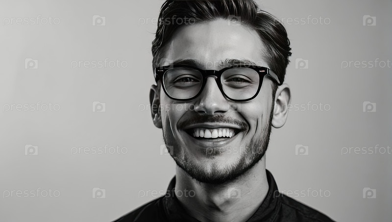 Молодой белый мужчина в дизайнерских очках, нейтральный фон, образ жизни работы из дома, нарушение цифрового зрения, студенческий возраст, советы по здоровью, пространство для информационного текста
