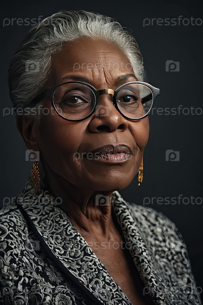 Зрелая афроамериканская женщина, полосатые очки, темно-синяя блузка, овальное лицо, черный фон. катаракта, синдром сухости глаз, повреждение роговицы старшего возраста, дилемма стиля, графическая картина журнала, открытый слот текста