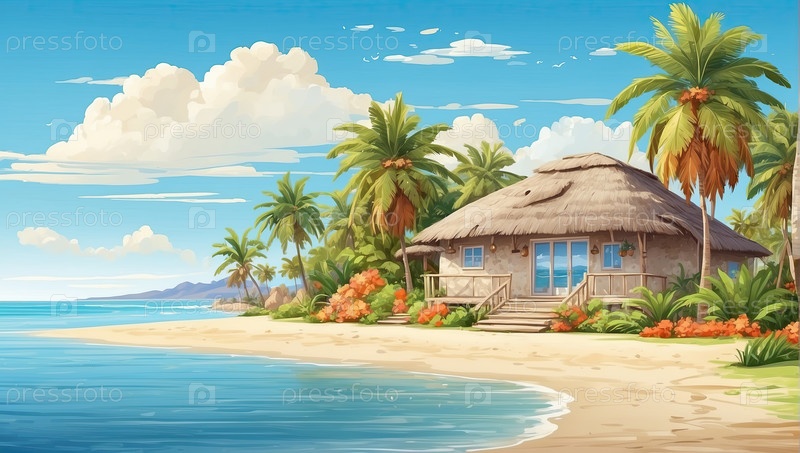 Современный пляжный бунгало у пальмовых деревьев, эксклюзивное жилье с комплексом "все включено", живописные виды на океан, спокойное путешествие, цифровая иллюстрация