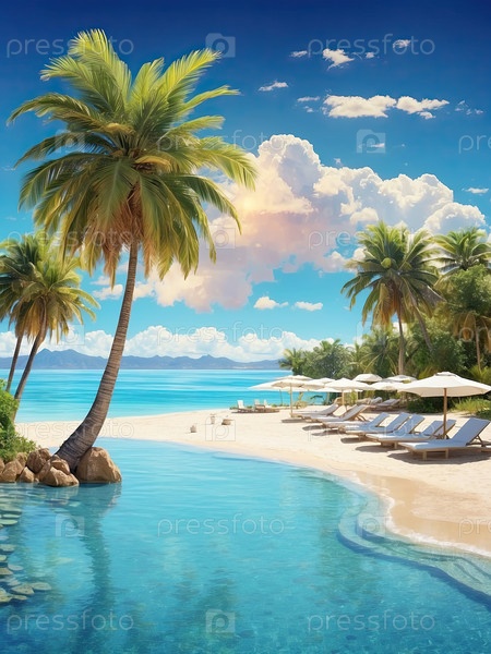 Пальмовые деревья, обрамляющие пляжный бассейн, роскошные каникулы, оздоровительные развлечения, комфорт, летнее приключение, пространство для рекламного текста в верхнем или левом крае