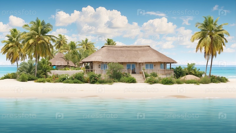 Океанский бунгало в пальмовой роще, люксовый отдых со всем включенным, частный семейный курорт, летнее расслабление, цифровая иллюстрация мультфильмов для туризма
