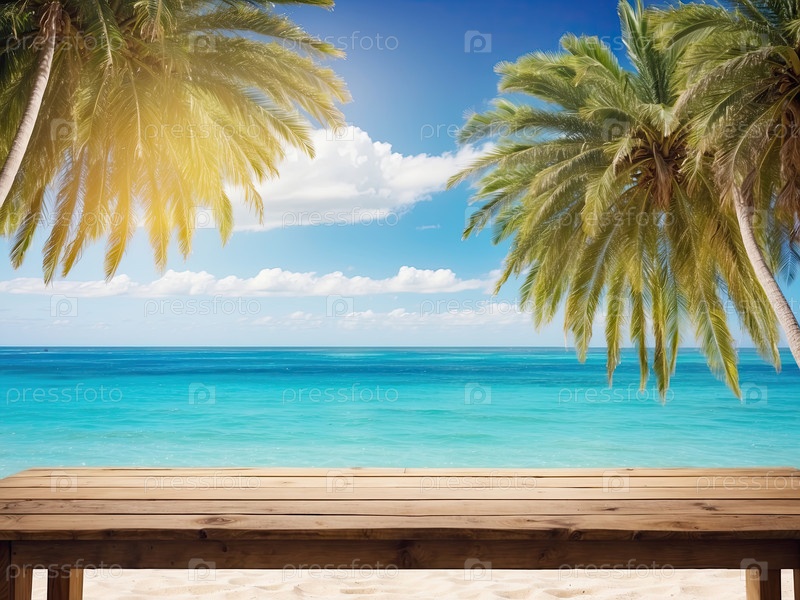 Деревянный пирс на бирюзовом пляже, роскошный туризм, летний маркетинг, подиум для фотографии продукта или еды, зона для логотипа, баннер / веб-дизайн