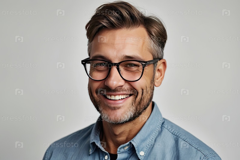 Современный белый мужчина в очках, борода, синяя рубашка, полуулыбка, студия, серый фон