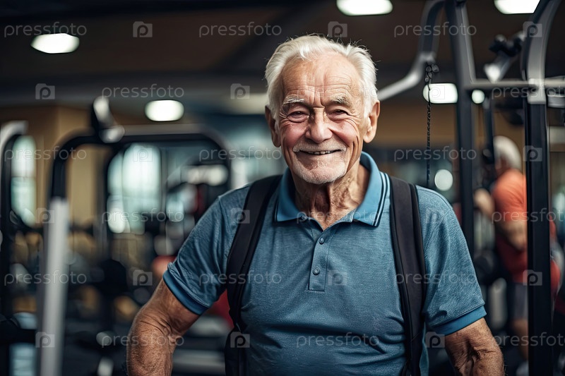 Кавказский пожилой мужчина, около 75 лет, фитнес-клуб, тренажерный зал, голубая спортивная рубашка, здоровье, личное благополучие, улыбка, активное старение, фитнес, реклама, редакция