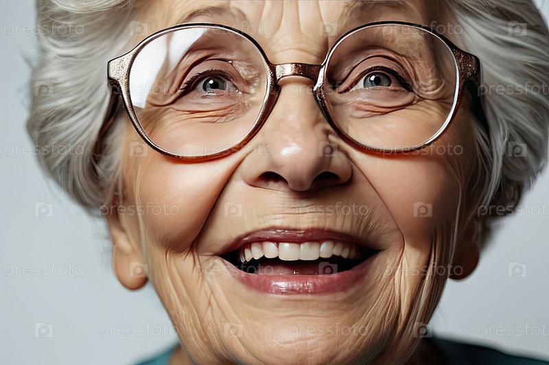 Близкий снимок пожилой белокожей женщины в очках, широкая улыбка, яркий фон. продвинутая потеря зрения, сильная коррекция, старший оптимизм, журнал социального здравоохранения, информационная область