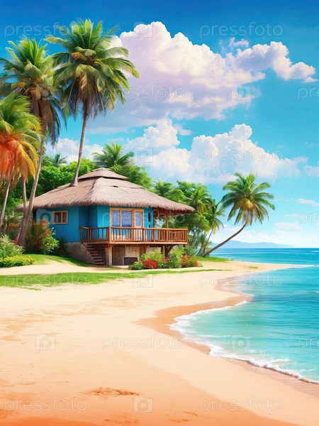 Дом на пляже с пальмами на бирюзовом побережье, эксклюзивная аренда "все включено", семейный летний рай, цифровая иллюстрация мультфильмов, место для отдыха