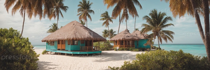 Бунгало на песчаной лагуне с видом на океан, частный отдых для путешествий со всем включенным, тропический уход, иллюстрация цифровой живописи
