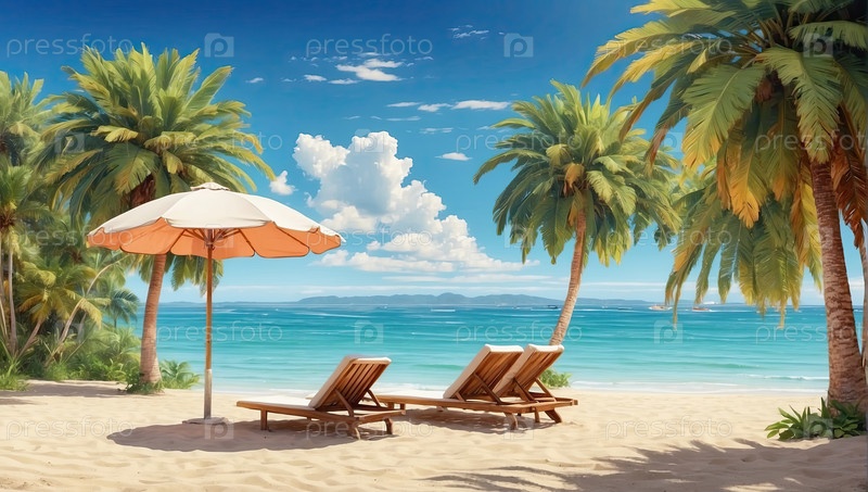 Пляжные шезлонги под зонтиком, тропический туризм, комфорт и расслабление, защита от солнца, промо-продажи туров, пространство для текста на песчаном участке