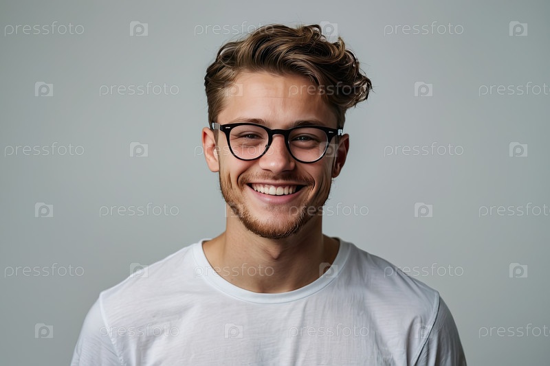Улыбающийся молодой человек в очках, яркий минималистический фон, современный студент, цифровое утомление глаз, работа с компьютером, модная профилактика, образование и здоровье, пространство для рекламы