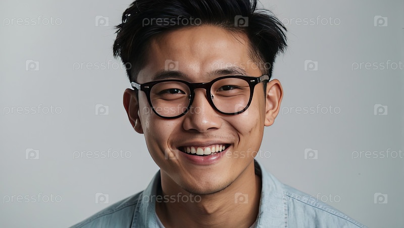 Счастливый азиатский мужчина с модной стрижкой, очки, студент университета, простой фон, здоровье зрения, компьютерное обучение, защита от синего света, оздоровление, текстовая зона