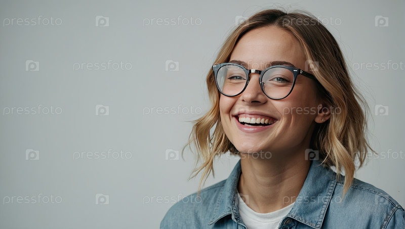 Блондинка в классических квадратных очках, обычная студия, синий верх, улыбка.Путешествие коррекции, выбор формы и комфорта, советы по образу жизни для подростков, информационный ресурс для клиник и электронного обучения