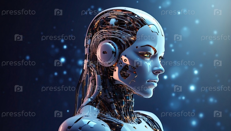 Женский робот искусственного интеллекта, освещенный голубым неоном, цифровой кибер-фон боке, концепция футуристического интеллекта, пространство для копирования сообщения слева