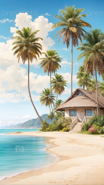 Береговая бунгало рядом с лагуной, эксклюзивное семейное летнее пребывание все включено, тропическое гостеприимство, цифровая иллюстрация живописи