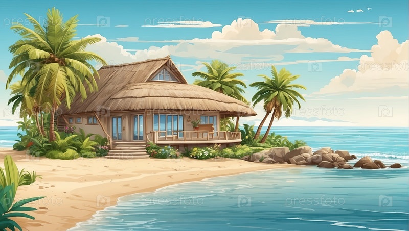 Пляжная вилла на бирюзовой воде, все включенное райское семейное пребывание, пальмы, отдых, цифровая иллюстрация мультфильмов, баннер для путешествий