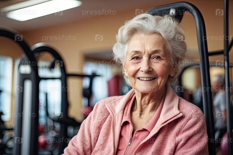 Кавказская пожилая женщина, около 75 лет, светло-розовая спортивная одежда, тренажерный зал, улыбка, фитнес, здоровый образ жизни, оздоровление, редакция, уход за престарелыми, реклама