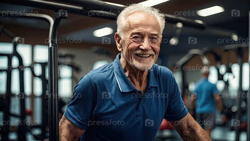 Пожилой белый мужчина, 75, в синем фитнес-поло, тренажерный зал, здоровый старший, улыбающийся, оздоровление, жизнеспособность, активное старение, редакция, реклама, веб-промо