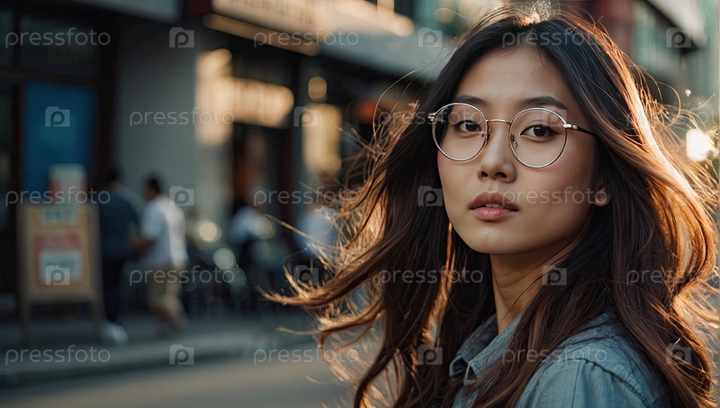 Молодая азиатская женщина в очках с тонкой металлической рамой на городском проспекте, мягкий солнечный свет. подвергается коррекции зрения, проблема урбанистического стиля, современный вид, использование в оптике или молодежной рекламе