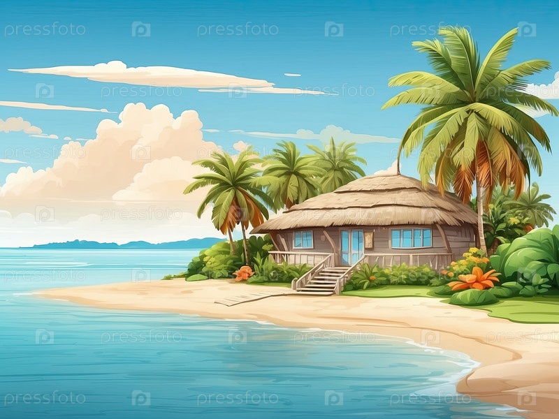 Современная пляжная вилла на чистом песке, семейный рай с комплексом "все включено", частный океанский отдых, релаксация, цифровое мультфильмовое искусство, бронирование сайта путешествий