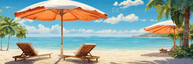 Оранжевые зонтики и шезлонги, пляжный рай, солнечная безопасность, рекламные визуальные эффекты, продажи летних поездок, пустое место для слогана или текста справа