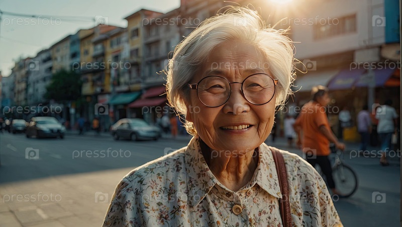 Старшая азиатская женщина в жемчужных серьгах, светло-синий шарф, улыбка, дорожная тротуарная полоса, трафик. катаракта, астигматизм, замешательство зрения, статья о старшем руководстве, организация здравоохранения, поле копирования