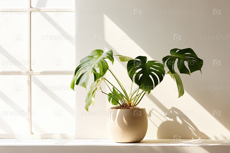 Monstera deliciosa - горшечное комнатное растение на подоконнике в солнечном современном интерьере, стильный зеленый декор для дома или офиса, тропическая ботаническая тенденция