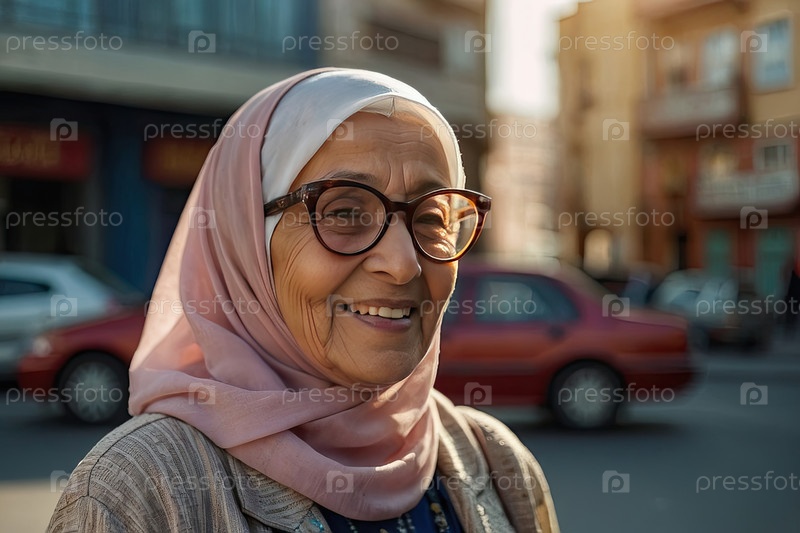 Арабская женщина в розовом хиджабе и очках улыбается на городской улице с пространством для текста, коррекции зрения, офтальмологии, моды и разнообразия в использовании очков