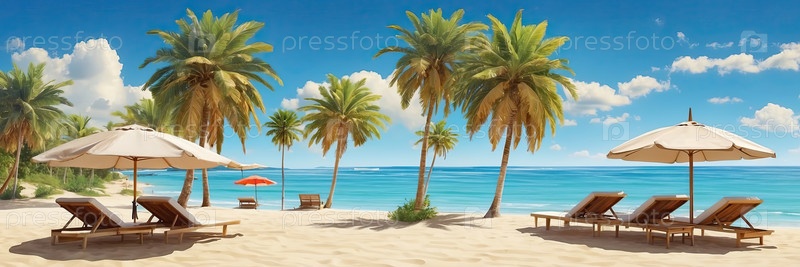 Горизонтальное расположение пляжа, шезлонги и зонтики, концепция туризма, удовольствие, комфорт, защита от солнца, пространство для заголовка/баннера на небе