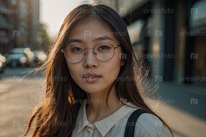 Стильная азиатская девушка в современных круглых очках, бежевая куртка, улица города заката. нужды коррекции, соответствие формы лица, проблема моды, молодежная городская, иллюстрация блога / Instagram, текстовое пространство